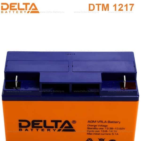 Герметизированный VRLA cвинцово-кислотный аккумулятор Delta DTM 1217 напряжением 12В и емкостью 17Ач изготовлен по технологии AGM (с микропористым заполнителем, пропитанным электролитом). Корпус изготовлен из негорючего ABS пластика. Срок службы аккумулятора достигает 6 лет. Аккумулятор предназначен для работы в режиме постоянного подзаряда (буферный режим) или в режиме разряд-заряд (циклический режим). Обладает низким внутренним сопротивлением и саморазрядом.